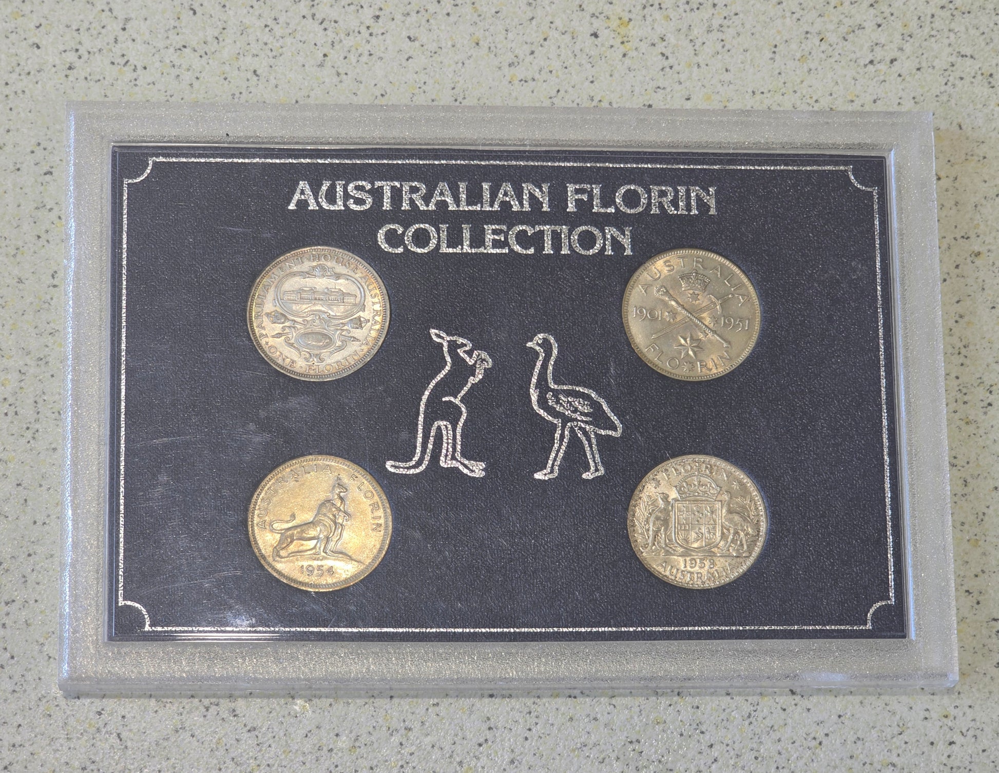 Featuring florins from 1927, 1951, 1954, and 1958